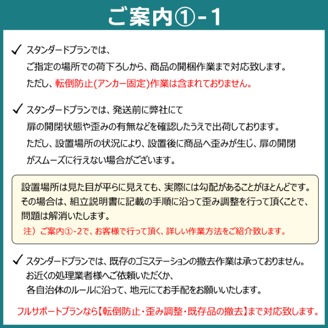 - 荷卸しの際には、お客様立会いの上、必ずトラック停車位置のすぐ脇に、荷卸し場所の確保をお願い致します。