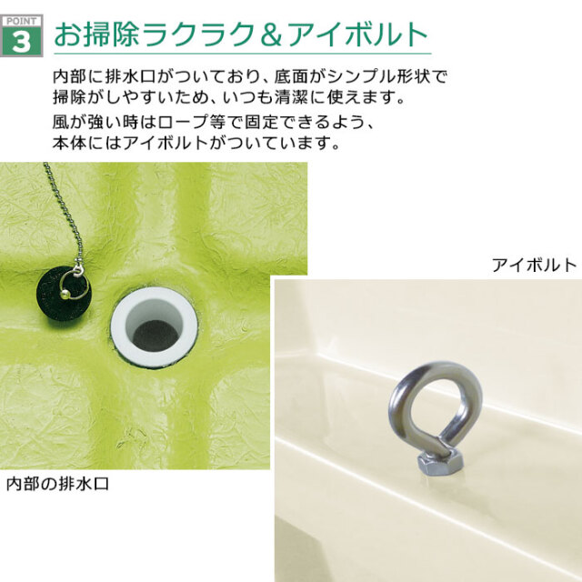 - 底部一体成型ですので水が漏れる心配もなく、排水口付きですのでお掃除も簡単です。
