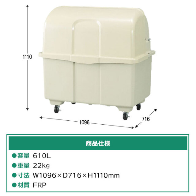 - 耐久性に優れたFRP(繊維強化プラスチック)製ですので、色あせしにくい業務用大型ごみ箱です。