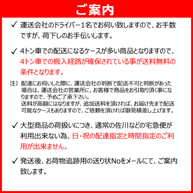 - 納品時間の確認につきましては、商品発送後にメールもしくは、お電話にて運送業者及び送り状番号をご案内致しますので、お客様から配達予定日に運送業者の配達店に直接ご連絡して頂き、配達予定をご確認後にお荷受けをお願い致します。