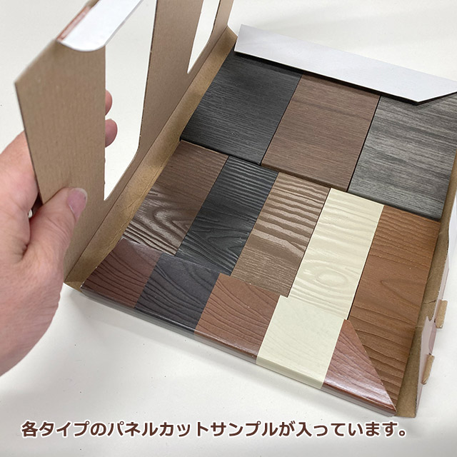 ネオカットウッドフェンスをご購入前に、色や質感をご確認いただくためのパネルサンプルです。全タイプのカットサンプルとカタログを無料でお届けいたします。