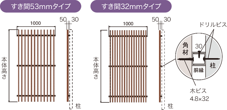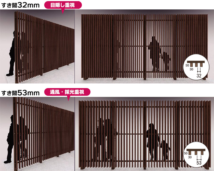 角材のすき間は『32mm』と『53mm』をご用意。プライバシーの確保や通風・採光など様々な用途にあわせてすき間をお選びください。