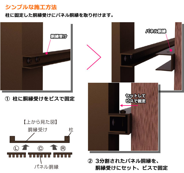 柱に固定した胴縁受けに、パネル胴縁を取り付けるだけの簡単施工。パネルは3つのユニットに分割されており、施工のしやすさにも考慮されています。